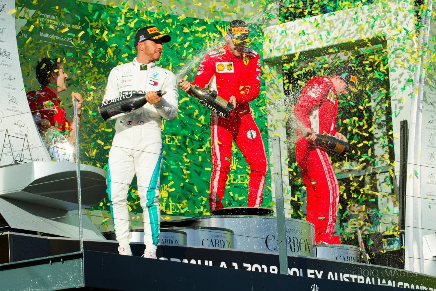 Lewis Hamilton(L), race winner Sebastian Vettel (C) and Kimi Räikkönen (R) celebrate on the podium following the Australian Grand Prix on March 25, 2018 in Melbourne, Australia.